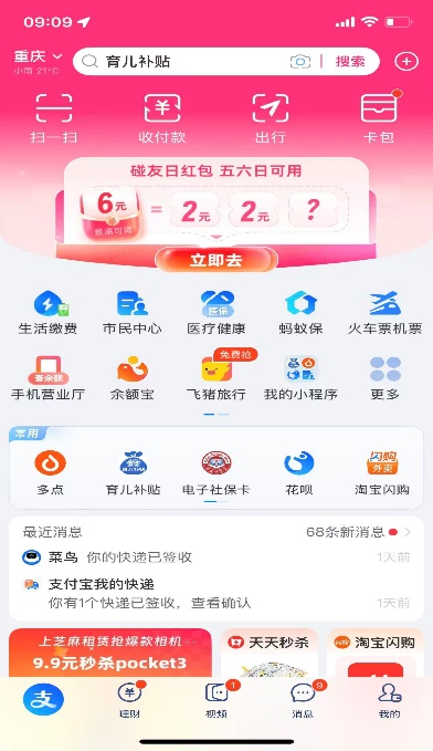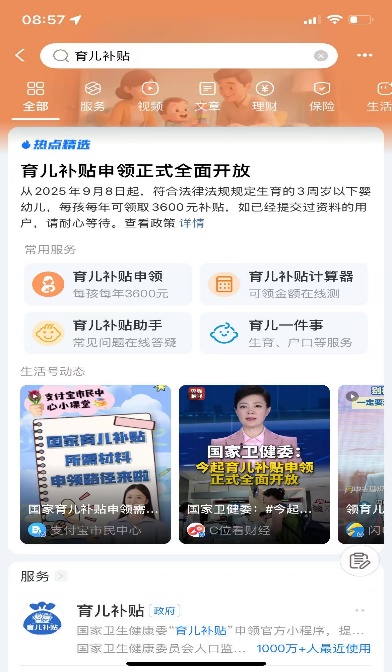 1.打开支付宝搜索“育儿补贴”并进入申领通道;