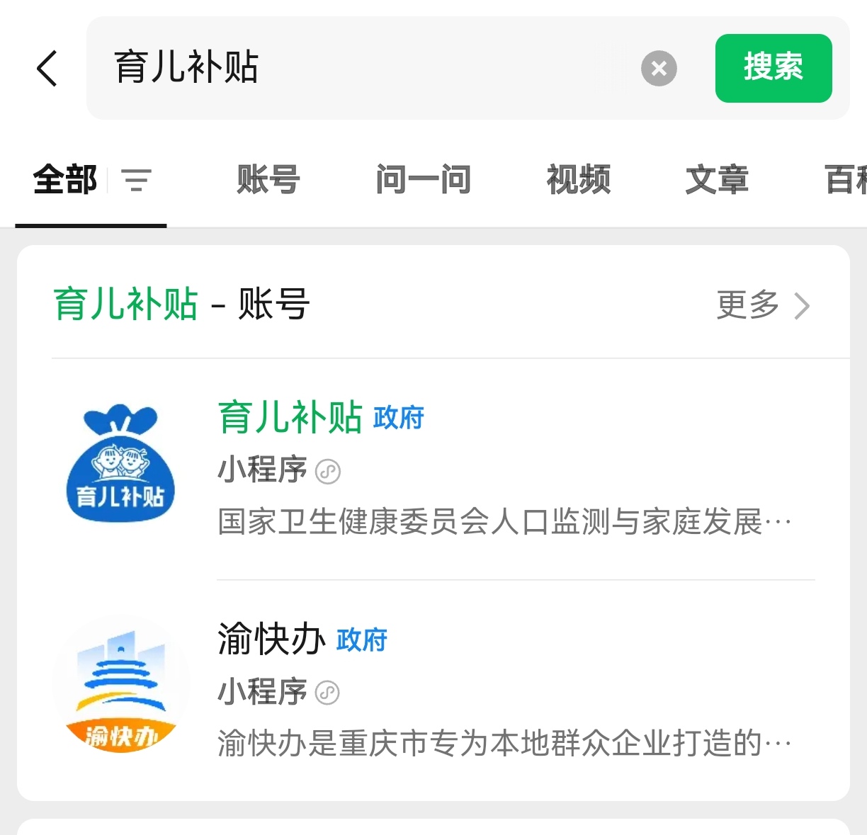 1.微信上方搜索并进入“育儿补贴”小程序,填写好婴儿户籍所在省份(如重庆市);