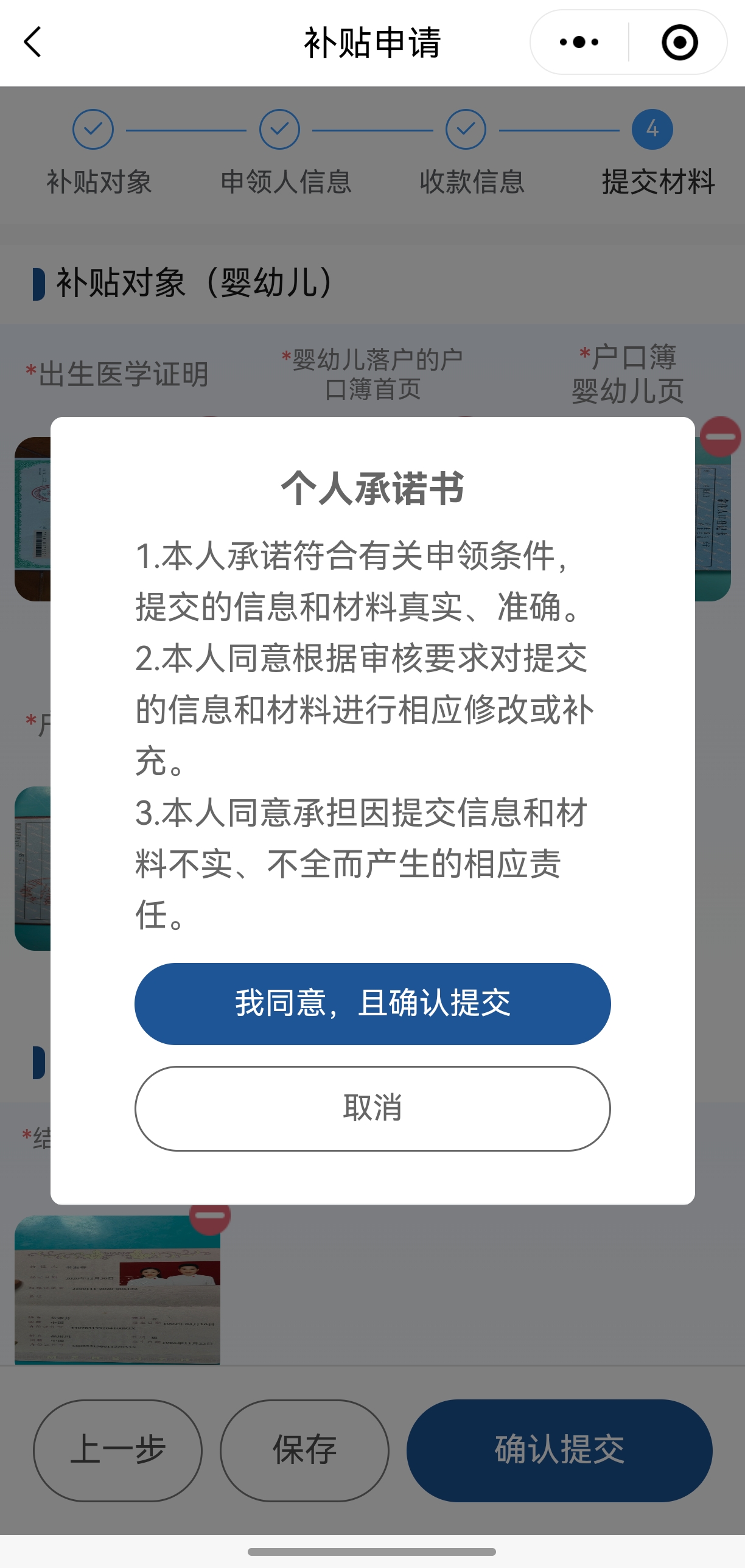 3.按照申请流程完善信息及上传相关材料,确认提交完成申领。(上传材料包括:婴幼儿的出生医学证明、户口簿首页及婴幼儿页、结婚证,以及判定抚养关系等相关材料)