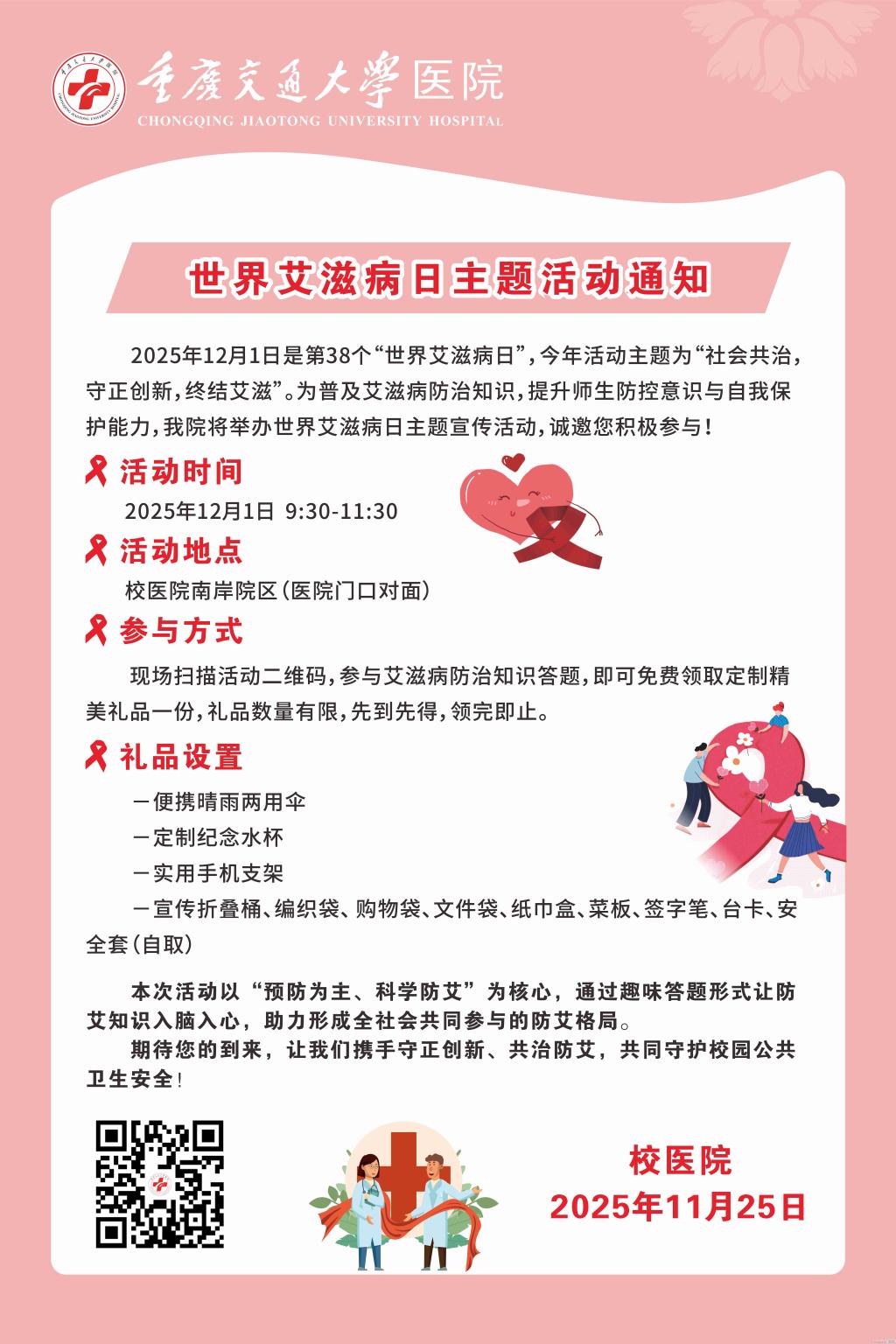 2025 年 12 月 1 日是第 38 个 “世界艾滋病日”,为普及艾滋病防治知识、提升防控意识,校医院将举办主题宣传活动。