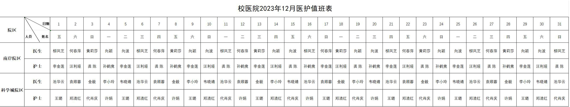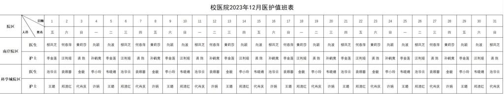 校医院2023年12月医护值班表